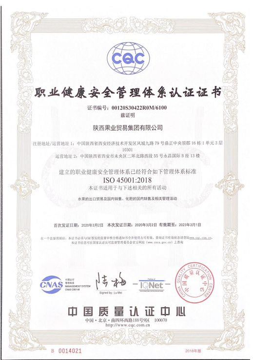 陜果貿(mào)易公司取得職業(yè)健康安全和環(huán)境管理體系兩項(xiàng)認(rèn)證