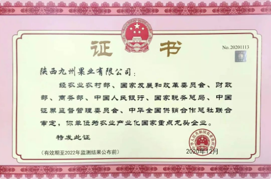 點擊量:89973日前,農(nóng)業(yè)農(nóng)村部發(fā)布《關(guān)于公布第九次監(jiān)測合格農(nóng)業(yè)產(chǎn)業(yè)化國家重點龍頭企業(yè)名單的通知》,集團(tuán)下屬陜西九州果業(yè)有限公司通過了中省市的動態(tài)監(jiān)測,繼續(xù)保留“農(nóng)業(yè)產(chǎn)業(yè)化國家重點龍頭企業(yè)”殊榮?!稗r(nóng)業(yè)產(chǎn)業(yè)化國家重點龍頭企業(yè)”由農(nóng)業(yè)農(nóng)村部、國家發(fā)展改革......
